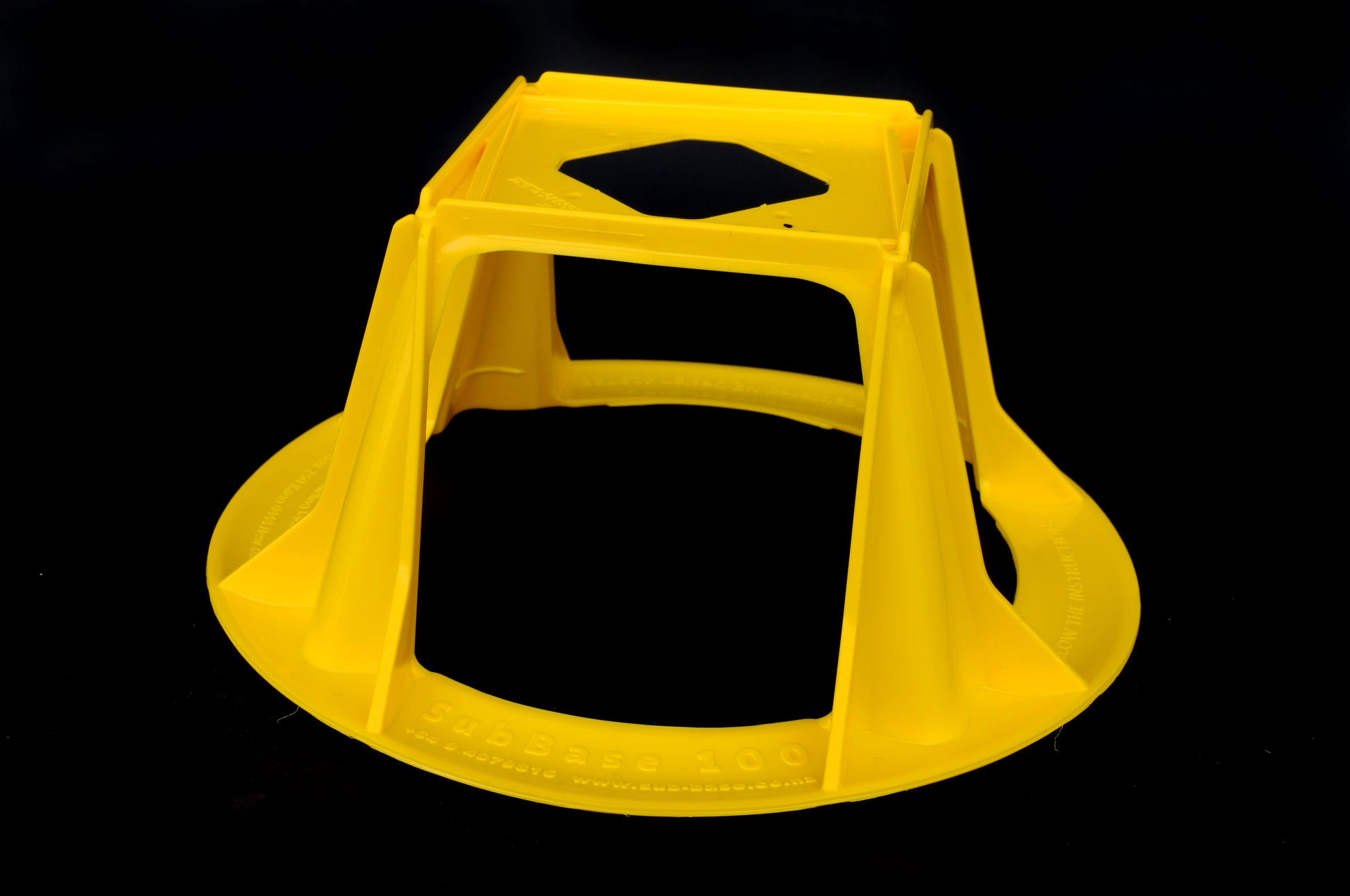 Made from bright plastic, SubBase100 are low cost, extremely strong, lightweight and stackable. Each SubBase100 can support over 400kg so piles and posts can be cut to length and bearers of fence rails fixed in place before the concrete is poured.